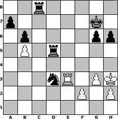 Partie-Notation im PGN-Format [Event "< 1500 Nr. 2"] [Site "www.mySchach.de"] [Date "2010.04.07"] [Round "1"] [White "reisender"] [Black "neve"] [ECO "C01"] [WhitemyELO "1378"] [BlackmyELO "1419"] [Result "0-1"] [TimeControl "10/2592000"] [WhiteDays "30"] [BlackDays "30"] [MySchachNr "64594"] 1. e4 e6 2. d4 d5 3. Bd3 dxe4 4. Bxe4 Nf6 5. Nc3 Nxe4 6. Nxe4 c5 7. Ne2 cxd4 8. Nxd4 e5 9. Nf3 Qxd1+ 10. Kxd1 f5 11. Ned2 e4 12. Nd4 Bc5 13. c3 b6 14. b4 Bxd4 15. cxd4 Nc6 16. b5 Nxd4 17. Rb1 O-O 18. Rb4 Rd8 19. Bb2 Ne6 20. Re1 Nf4 21. Rb3 Be6 22. Rg3 g6 23. Rg5 Rd7 24. g3 Nd3 25. Re2 Nxb2+ 26. Ke1 Nd3+ 27. Kf1 Kg7 28. Nxe4 fxe4 29. Rxe4 Bxa2 30. Re3 Rc8 31. Kg2 Bd5+ 32. Kh3 h6 33. Rxd5 Rxd5 0-1 Stellungs-Notation im FEN-Format 2r5/p5k1/1p4pp/1P1r4/8/3nR1PK/5P1P/8 - - - 0 34 Geschlagene Figuren Weiss: Geschlagene Figuren Schwarz: Klicken Sie auf eine geschlagene Figur um den gewünschten Zug darzustellen!