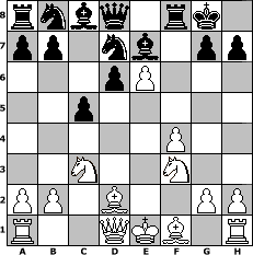 Partie-Notation im PGN-Format [Event "Modernes Benoni"] [Site "www.mySchach.de"] [Date "2010.01.14"] [Round "1"] [White "schoemi"] [Black "Krypton"] [ECO "A65"] [WhitemyELO "1546"] [BlackmyELO "1454"] [Result "1-0"] [TimeControl "10/2592000"] [WhiteDays "52"] [BlackDays "00"] [MySchachNr "62393"] 1. d4 Nf6 2. c4 c5 3. d5 e6 4. Nc3 exd5 5. cxd5 d6 6. e4 Be7 7. f4 O-O 8. Nf3 Qa5 9. e5 Nfd7 10. Bd2 Qd8 11. e6 fxe6 12. dxe6 1-0 Stellungs-Notation im FEN-Format rnbq1rk1/pp1nb1pp/3pP3/2p5/5P2/2N2N2/PP1B2PP/R2QKB1R - KQ - 0 12 Geschlagene Figuren Weiss: Geschlagene Figuren Schwarz: Klicken Sie auf eine geschlagene Figur um den gewünschten Zug darzustellen!