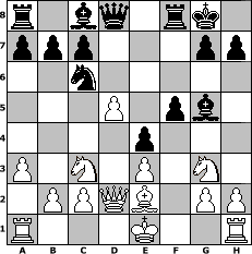 Partie-Notation im PGN-Format [Event "Alapin-Diemer-Gambit Thematurnier"] [Site "www.mySchach.de"] [Date "2010.01.23"] [Round "1"] [White "martinus"] [Black "Kloetzchenschieber"] [ECO "C01"] [WhitemyELO "1744"] [BlackmyELO "1758"] [Result "1-0"] [TimeControl "10/2592000"] [WhiteDays "58"] [BlackDays "00"] [MySchachNr "62551"] 1. e4 e6 2. d4 d5 3. Be3 dxe4 4. Nc3 Nf6 5. Nge2 Be7 6. Ng3 O-O 7. Be2 Nd5 8. Ngxe4 Nxe3 9. fxe3 f5 10. Ng3 Bg5 11. Qd3 Nc6 12. a3 e5 13. d5 e4 14. Qd2 1-0 Stellungs-Notation im FEN-Format r1bq1rk1/ppp3pp/2n5/3P1pb1/4p3/P1N1P1N1/1PPQB1PP/R3K2R - KQ - 1 14 Geschlagene Figuren Weiss: Geschlagene Figuren Schwarz: Klicken Sie auf eine geschlagene Figur um den gewünschten Zug darzustellen!