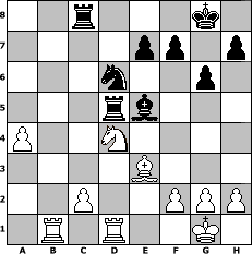 Partie-Notation im PGN-Format [Event "MLN Thematurnier 1"] [Site "www.mySchach.de"] [Date "2013.07.09"] [Round "1"] [White "DianaHelmund"] [Black "espero"] [ECO "A10"] [WhitemyELO "1520"] [BlackmyELO "1734"] [Result "0-1"] [TimeControl "10/1728000"] [WhiteDays "17"] [BlackDays "20"] [MySchachNr "89227"] 1. c4 b5 2. cxb5 a6 3. e4 axb5 4. Bxb5 Bb7 5. Nc3 g6 6. Nf3 Bg7 7. d4 Nf6 8. Bc4 O-O 9. e5 Ne8 10. O-O d5 11. Qb3 dxc4 12. Qxb7 Nd7 13. Qd5 Nb6 14. Qxd8 Rxd8 15. a4 Nd5 16. Nxd5 Rxd5 17. Rd1 c5 18. Be3 cxd4 19. b4 cxb3 20. Nxd4 b2 21. Rab1 Bxe5 22. Rxb2 Nd6 23. Rbb1 Rc8 0-1 Stellungs-Notation im FEN-Format 2r3k1/4pp1p/3n2p1/3rb3/P2N4/4B3/2P2PPP/1R1R2K1 - - - 3 24 Geschlagene Figuren Weiss: Geschlagene Figuren Schwarz: Klicken Sie auf eine geschlagene Figur um den gewünschten Zug darzustellen!