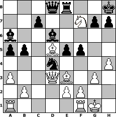 Partie-Notation im PGN-Format [Event "Dabei ist alles 9"] [Site "www.mySchach.de"] [Date "2010.03.22"] [Round "1"] [White "freizeitspieler"] [Black "Knight"] [ECO "A46"] [WhitemyELO "1573"] [BlackmyELO "1135"] [Result "1-0"] [TimeControl "10/864000"] [WhiteDays "09"] [BlackDays "10"] [MySchachNr "64227"] 1. d4 Nf6 2. Nf3 e6 3. g3 d5 4. Bg2 Bd6 5. O-O Nc6 6. Nbd2 O-O 7. c4 dxc4 8. Nxc4 Re8 9. Qc2 Nd5 10. a3 a5 11. h4 b5 12. Ng5 f5 13. Ne3 Nxd4 14. Qd3 Nxe3 15. Bxe3 e5 16. Bxa8 Ba6 17. Bd5+ Kh8 18. Nf7+ 1-0 Stellungs-Notation im FEN-Format 3qr2k/2p2Npp/b2b4/pp1Bpp2/3n3P/P2QB1P1/1P2PP2/R4RK1 - - - 4 18 Geschlagene Figuren Weiss: Geschlagene Figuren Schwarz: Klicken Sie auf eine geschlagene Figur um den gewünschten Zug darzustellen!