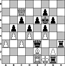 Partie-Notation im PGN-Format [Event "Zwischendurch mal ein paar eigene Z"] [Site "www.mySchach.de"] [Date "2009.02.11"] [Round "1"] [White "Master1"] [Black "rikilatic"] [ECO "D00"] [WhitemyELO "1280"] [BlackmyELO "1386"] [Result "0-1"] [TimeControl "10/1728000"] [WhiteDays "99"] [BlackDays "85"] [MySchachNr "52693"] 1. d4 d5 2. Bf4 Bf5 3. Nc3 c6 4. Nf3 Nf6 5. e3 Qb6 6. Rb1 e6 7. a3 Nbd7 8. Bd3 Ne4 9. O-O Ndf6 10. Nh4 Bg6 11. Qe1 Bd6 12. Nxe4 Bxf4 13. Nxf6+ gxf6 14. Nxg6 Bxh2+ 15. Kxh2 hxg6+ 16. Kg1 O-O-O 17. f3 Rh5 18. Qg3 Qa5 19. c3 Rg5 20. Qh3 Rh5 21. Qg3 Rdh8 22. Kf2 Kd7 23. f4 f5 24. Be2 Rh4 25. Qg5 b5 26. Qf6 Ke8 27. Bf3 Qa4 28. Rg1 Qc2+ 29. Be2 Rh2 30. Qe5 Kd7 31. Qf6 Ke8 32. b4 Qe4 33. Bf3 Qc2+ 34. Be2 Qe4 35. Bf3 Qc2+ 36. Be2 R8h3 37. Qe5 Qd2 38. Qb8+ Ke7 39. Qxa7+ Kf6 40. Rbe1 Qxe3+ 41. Kf1 Rh1 42. Qc7 Rxg1# 0-1 Stellungs-Notation im FEN-Format 8/2Q2p2/2p1pkp1/1p1p1p2/1P1P1P2/P1P1q2r/4B1P1/4RKr1 - - - 0 43 Geschlagene Figuren Weiss: Geschlagene Figuren Schwarz: Klicken Sie auf eine geschlagene Figur um den gewünschten Zug darzustellen!