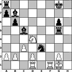 Partie-Notation im PGN-Format [Event "F"] [Site "www.mySchach.de"] [Date "2008.07.24"] [Round "1"] [White "Knight"] [Black "Ostseeboy"] [ECO "A45"] [WhitemyELO "1248"] [BlackmyELO "1308"] [Result "0-1"] [TimeControl "10/1728000"] [WhiteDays "20"] [BlackDays "20"] [MySchachNr "46515"] 1. d4 Nf6 2. Nc3 e6 3. e4 d6 4. Bg5 Be7 5. Nf3 O-O 6. Bd3 Nc6 7. O-O Nb4 8. e5 Nxd3 9. Qxd3 dxe5 10. Nxe5 g6 11. Bh6 Re8 12. f4 b6 13. h4 Bb7 14. h5 c5 15. hxg6 fxg6 16. Nxg6 Qxd4+ 17. Qxd4 cxd4 18. Nb5 hxg6 19. Nxd4 Bc5 20. c3 Ng4 21. Bg5 e5 22. fxe5 Rxe5 23. Rae1 Rxg5 24. Rd1 Ne3 0-1 Stellungs-Notation im FEN-Format r5k1/pb6/1p4p1/2b3r1/3N4/2P1n3/PP1P2P1/3R1RK1 - - - 2 25 Geschlagene Figuren Weiss: Geschlagene Figuren Schwarz: Klicken Sie auf eine geschlagene Figur um den gewünschten Zug darzustellen!