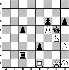 Partie-Notation im PGN-Format [Event "1-2009"] [Site "www.mySchach.de"] [Date "2009.01.01"] [Round "1"] [White "rux"] [Black "Andreas"] [ECO "A22"] [WhitemyELO "1420"] [BlackmyELO "1509"] [Result "1/2-1/2"] [TimeControl "10/1728000"] [WhiteDays "100"] [BlackDays "077"] [MySchachNr "51244"] 1. c4 e5 2. Nc3 Nf6 3. a3 Be7 4. e4 c6 5. b4 O-O 6. d3 b6 7. Be2 Bb7 8. Bg4 Nxg4 9. Qxg4 d5 10. Bh6 Bf6 11. Qg3 dxc4 12. dxc4 Qd4 13. Nge2 Qxc4 14. O-O Rd8 15. Rad1 Na6 16. Bg5 Bxg5 17. Qxg5 f6 18. Qg4 c5 19. b5 Nc7 20. Rd7 Rxd7 21. Qxd7 Qf7 22. Rd1 h6 23. Qxf7+ Kxf7 24. Rd7+ Kf8 25. Rxc7 Bc8 26. f4 Bg4 27. h3 Be6 28. f5 Bc4 29. Ng3 Bf7 30. Nd5 Bxd5 31. exd5 a6 32. d6 axb5 33. d7 Rd8 34. Rc8 Ke7 35. Rc6 Rxd7 36. Rxb6 Ra7 37. Nh5 Rxa3 38. Rxb5 Kd6 39. Nxg7 e4 40. Nh5 e3 41. Rb1 Ke5 42. g4 Ra2 43. Ng3 Kf4 44. Nh1 Rc2 45. Rf1+ Kg5 46. Re1 1/2-1/2 Stellungs-Notation im FEN-Format 8/8/5p1p/2p2Pk1/6P1/4p2P/2r5/4R1KN - - - 8 46 Geschlagene Figuren Weiss: Geschlagene Figuren Schwarz: Klicken Sie auf eine geschlagene Figur um den gewünschten Zug darzustellen!