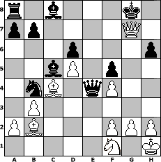 Partie-Notation im PGN-Format [Event "?"] [Site "www.mySchach.de"] [Date "2022.08.03"] [Round "?"] [White "beowulf"] [Black "lotchi"] [ECO "A02"] [WhitemyELO "1478"] [BlackmyELO "1347"] [Result "1-0"] [TimeControl "10/1728000"] [WhiteDays "60"] [BlackDays "60"] [MySchachNr "126705"] 1. f4 f5 2. Nf3 Nf6 3. b3 e6 4. Bb2 Bc5 5. e3 h6 6. Be2 d6 7. O-O O-O 8. d4 Bb6 9. c4 c5 10. d5 exd5 11. cxd5 Na6 12. Nc3 Re8 13. Bd3 Rxe3 14. Qd2 c4 15. Bxc4 Ne4 16. Nxe4 Rxe4+ 17. Kh1 Be3 18. Qd3 Qe8 19. Rfe1 Bc5 20. Nd2 Rxe1+ 21. Rxe1 Qxe1+ 22. Nf1 Qe8 23. Qf3 Qe4 24. Qg3 Nb4 25. Qxg7# 1-0 Stellungs-Notation im FEN-Format r1b3k1/pp4Q1/3p3p/2bP1p2/1nB1qP2/1P6/PB3PPP/5N1K - - - 0 25 Geschlagene Figuren Weiss: Geschlagene Figuren Schwarz: Klicken Sie auf eine geschlagene Figur um den gewünschten Zug darzustellen!