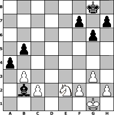 Partie-Notation im PGN-Format [Event "?"] [Site "www.mySchach.de"] [Date "2025.11.01"] [Round "?"] [White "Alencar"] [Black "deepsabel"] [ECO "A13"] [WhitemyELO "1313"] [BlackmyELO "1802"] [Result "0-1"] [TimeControl "10/2592000"] [WhiteDays "78"] [BlackDays "73"] [MySchachNr "133838"] 1. c4 e6 2. Nc3 d5 3. cxd5 exd5 4. g3 Nf6 5. d4 c6 6. Bg2 Nbd7 7. Bg5 Be7 8. Bxf6 Nxf6 9. e4 dxe4 10. Nxe4 Nxe4 11. Bxe4 O-O 12. Qd3 g6 13. d5 cxd5 14. Bf3 Bf5 15. Qxd5 Qxd5 16. Bxd5 Rad8 17. Bb3 Bf6 18. Rd1 Bxb2 19. Rxd8 Rxd8 20. Ne2 b5 21. O-O a5 22. Rd1 Rxd1+ 23. Bxd1 Be6 24. Bb3 Bxb3 25. axb3 a4 0-1 Stellungs-Notation im FEN-Format 6k1/5p1p/6p1/1p6/p7/1P4P1/1bP1NP1P/6K1 - - - 0 26 Geschlagene Figuren Weiss: Geschlagene Figuren Schwarz: Klicken Sie auf eine geschlagene Figur um den gewünschten Zug darzustellen!