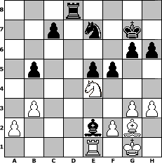 Partie-Notation im PGN-Format [Event "Bremer Schl"] [Site "www.mySchach.de"] [Date "2008.11.01"] [Round "1"] [White "Phantasos"] [Black "HenrySchinasky"] [ECO "A48"] [WhitemyELO "2124"] [BlackmyELO "2045"] [Result "1/2-1/2"] [TimeControl "10/2592000"] [WhiteDays "23"] [BlackDays "78"] [MySchachNr "49380"] 1. d4 Nf6 2. Nf3 g6 3. c4 Bg7 4. g3 O-O 5. Bg2 d6 6. O-O Nc6 7. Nc3 a6 8. b3 Rb8 9. Bd2 e5 10. dxe5 dxe5 11. Bg5 h6 12. Qxd8 Rxd8 13. Bxf6 Bxf6 14. Nd5 Kg7 15. Rad1 b5 16. Nd2 Be7 17. cxb5 axb5 18. Ne4 Bg4 19. Nxe7 Nxe7 20. h3 Bxe2 21. Rxd8 Rxd8 22. Re1 f5 1/2-1/2 Stellungs-Notation im FEN-Format 3r4/2p1n1k1/6pp/1p2pp2/4N3/1P4PP/P3bPB1/4R1K1 - - - 0 23 Geschlagene Figuren Weiss: Geschlagene Figuren Schwarz: Klicken Sie auf eine geschlagene Figur um den gewünschten Zug darzustellen!