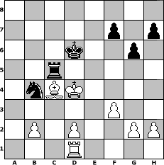 Partie-Notation im PGN-Format [Event "EU Weihnachts-Gipfel Spiele"] [Site "www.mySchach.de"] [Date "2011.12.25"] [Round "1"] [White "Steffi"] [Black "rux"] [ECO "E21"] [WhitemyELO "1548"] [BlackmyELO "1568"] [Result "1-0"] [TimeControl "10/1728000"] [WhiteDays "22"] [BlackDays "77"] [MySchachNr "78601"] 1. d4 Nf6 2. c4 e6 3. Nc3 Bb4 4. Nf3 d5 5. Bg5 c6 6. e3 Nbd7 7. Ne5 Be7 8. Nxd7 Nxd7 9. Bxe7 Qxe7 10. a3 dxc4 11. Bxc4 b5 12. Bd3 b4 13. axb4 Qxb4 14. Qc2 g6 15. O-O Nf6 16. Ne4 Ke7 17. Qxc6 Bd7 18. Qc5+ Qxc5 19. Nxc5 Bc6 20. Rfc1 Rhc8 21. f3 Nd5 22. Kf2 Nb4 23. Bc4 a5 24. e4 Rd8 25. Ke3 a4 26. d5 exd5 27. exd5 Bxd5 28. Rxa4 Rxa4 29. Nxa4 Rc8 30. Nb6 Rc5 31. Nxd5+ Nxd5+ 32. Kd4 Kd6 33. Re1 Nb4 34. Rd1 1-0 Stellungs-Notation im FEN-Format 8/5p1p/3k2p1/2r5/1nBK4/5P2/1P1P2PP/3R4 - - - 5 34 Geschlagene Figuren Weiss: Geschlagene Figuren Schwarz: Klicken Sie auf eine geschlagene Figur um den gewünschten Zug darzustellen!