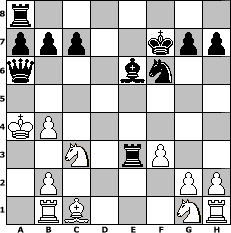 Partie-Notation im PGN-Format [Event "Vorweihnachtsturnier"] [Site "www.mySchach.de"] [Date "2010.11.23"] [Round "1"] [White "Lemmi11"] [Black "Lohl"] [ECO "A04"] [WhitemyELO "1811"] [BlackmyELO "1798"] [Result "0-1"] [TimeControl "10/3456000"] [WhiteDays "120"] [BlackDays "116"] [MySchachNr "70025"] 1. Nf3 f5 2. e4 fxe4 3. Ng5 Nf6 4. d3 Nc6 5. Qe2 exd3 6. cxd3 Nd4 7. Qd2 e5 8. Nc3 Bb4 9. Nge4 d5 10. a3 Nb3 11. Qg5 dxe4 12. Qxe5+ Kf7 13. Rb1 Re8 14. Qb5 Nd4 15. Qxb4 Nc2+ 16. Kd2 Nxb4 17. axb4 exd3 18. f3 Qd4 19. Bxd3 Re3 20. Kc2 Qxd3+ 21. Kb3 Be6+ 22. Ka4 Qa6# 0-1 Stellungs-Notation im FEN-Format r7/ppp2kpp/q3bn2/8/KP6/2N1rP2/1P4PP/1RB3NR - - - 4 23 Geschlagene Figuren Weiss: Geschlagene Figuren Schwarz: Klicken Sie auf eine geschlagene Figur um den gewünschten Zug darzustellen!