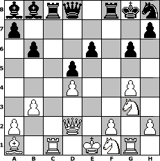 Partie-Notation im PGN-Format [Event "960 ChessSpa"] [Site "www.mySchach.de"] [Date "2005.11.11"] [Round "1"] [White "Kitama"] [Black "Look"] [Variant "Fischerrandom"] [SetUp "1"] [FEN "bbrqknrn/pppppppp/8/8/8/8/PPPPPPPP/BBRQKNRN w KQkq - 0 1"] [WhitemyELO "1660"] [BlackmyELO "1711"] [Result "0-1"] [TimeControl "10/2592000"] [WhiteDays "00"] [BlackDays "60"] [MySchachNr "19444"] 1. d4 c6 2. c4 Ne6 3. b3 g6 4. g3 b6 5. Be4 d5 6. cxd5 cxd5 7. Bf3 f5 8. g4 Ng5 9. Qd2 Nxf3+ 10. exf3 fxg4 11. fxg4 O-O 12. Nhg3 e6 0-1 Stellungs-Notation im FEN-Format bbrq1rkn/p6p/1p2p1p1/3p4/3P2P1/1P4N1/P2Q1P1P/B1R1KNR1 - KQ - 0 13 Geschlagene Figuren Weiss: ![]() ![]() ![]() ![]() ![]() ![]() ![]() ![]() ![]() ![]() ![]() ![]() ![]() ![]() ![]() Geschlagene Figuren Schwarz: ![]() ![]() ![]() ![]() ![]() ![]() ![]() ![]() ![]() ![]() ![]() ![]() ![]() ![]() ![]() Klicken Sie auf eine geschlagene Figur um den gewünschten Zug darzustellen!