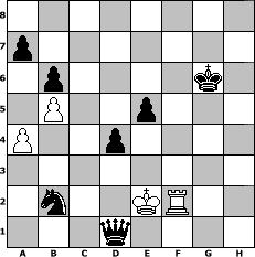 Partie-Notation im PGN-Format [Event "Schach dem Osterhasen IV"] [Site "www.mySchach.de"] [Date "2015.03.29"] [Round "1"] [White "Achimkogge"] [Black "alpacino"] [ECO "A45"] [WhitemyELO "1494"] [BlackmyELO "1273"] [Result "0-1"] [TimeControl "10/2592000"] [WhiteDays "199"] [BlackDays "187"] [MySchachNr "98732"] 1. d4 Nf6 2. c3 d5 3. Bf4 e6 4. Nf3 Bd6 5. Ne5 Bxe5 6. dxe5 Ne4 7. h4 Bd7 8. e3 Nc6 9. Bd3 Nc5 10. Bb5 Ne7 11. Bxd7+ Nxd7 12. Qg4 Nf5 13. Nd2 Qe7 14. O-O g6 15. Bg5 Nxe5 16. Qa4+ Qd7 17. Qxd7+ Nxd7 18. Nf3 O-O 19. g4 f6 20. Bf4 Nd6 21. Bxd6 cxd6 22. Nd4 Rfe8 23. Nb5 Red8 24. Nxd6 Rab8 25. Nb5 Ne5 26. f3 b6 27. Nd4 Kf7 28. f4 Nxg4 29. Nc6 Nxe3 30. Rfc1 Nf5 31. Nxd8+ Rxd8 32. Kf2 Nxh4 33. Rh1 g5 34. fxg5 fxg5 35. Ke2 Kg6 36. Rhg1 h6 37. Raf1 e5 38. a4 Nf5 39. Rd1 h5 40. b4 d4 41. c4 Ne3 42. Rc1 g4 43. Kd3 Nf5 44. Rce1 Kf6 45. b5 Re8 46. Ke4 Nd6+ 47. Kd3 Kg5 48. Rgf1 h4 49. Re2 h3 50. Ref2 Rd8 51. Rf8 Rd7 52. Rg8+ Kh4 53. Rg1 h2 54. R1xg4+ Kh3 55. Rg3+ Kh4 56. R8g4+ Kh5 57. Rg5+ Kh4 58. R5g4+ Kh5 59. Rg5+ Kh6 60. Rg8 h1=Q 61. Rh8+ Rh7 62. Rxh7+ Kxh7 63. Ke2 Nxc4 64. Rf3 Nb2 65. Rf7+ Kg6 66. Rf3 Qg2+ 67. Rf2 Qe4+ 68. Kf1 Qh1+ 69. Ke2 Qd1# 0-1 Stellungs-Notation im FEN-Format 8/p7/1p4k1/1P2p3/P2p4/8/1n2KR2/3q4 - - - 12 70 Geschlagene Figuren Weiss: Geschlagene Figuren Schwarz: Klicken Sie auf eine geschlagene Figur um den gewünschten Zug darzustellen!