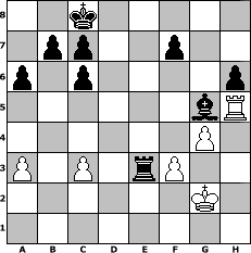| Partie-Notation im PGN-Format [Event "Mit Freude am Spiel..!"] [Site "www.mySchach.de"] [Date "2014.05.26"] [Round "1"] [White "Rotstift10"] [Black "Andylein1989"] [ECO "C68"] [WhitemyELO "1599"] [BlackmyELO "1532"] [Result "0-1"] [TimeControl "10/1728000"] [WhiteDays "16"] [BlackDays "20"] [MySchachNr "94538"] 1. e4 e5 2. Nf3 Nc6 3. Bb5 a6 4. Bxc6 dxc6 5. d4 exd4 6. Qxd4 Bg4 7. Qe5+ Be7 8. Nbd2 Nf6 9. h3 Bh5 10. g4 Bg6 11. Nh4 Nd7 12. Qxg7 Bf6 13. Qh6 Bxh4 14. Nf3 Bxe4 15. Qe3 Qe7 16. O-O Bxf3 17. Qxf3 O-O-O 18. Be3 Qf6 19. Qxf6 Nxf6 20. c3 Rhe8 21. Rfd1 Ne4 22. Rd4 Rxd4 23. Bxd4 Nd2 24. Be3 Nc4 25. Bd4 Nxb2 26. Be3 Nc4 27. Bd4 Re2 28. Kf1 Rd2 29. Kg2 Nb2 30. Rf1 Nd3 31. a3 Nf4+ 32. Kh2 Rd3 33. f3 Rd2+ 34. Kh1 Nxh3 35. Be3 Re2 36. Bd4 Bg3 37. Bg1 Nxg1 38. Kxg1 Re3 39. Kg2 Bf4 40. Rh1 h6 41. Rh5 Bg5 0-1 Stellungs-Notation im FEN-Format 2k5/1pp2p2/p1p4p/6bR/6P1/P1P1rP2/6K1/8 - - - 2 42 Geschlagene Figuren Weiss:                              Geschlagene Figuren Schwarz:                               Klicken Sie auf eine geschlagene Figur um den gewünschten Zug darzustellen!