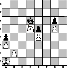 | Partie-Notation im PGN-Format [Event "gunnis Herbstturnier"] [Site "www.mySchach.de"] [Date "2013.10.31"] [Round "1"] [White "Knight"] [Black "wiesel"] [ECO "A34"] [WhitemyELO "1222"] [BlackmyELO "1207"] [Result "1/2-1/2"] [TimeControl "10/2592000"] [WhiteDays "180"] [BlackDays "165"] [MySchachNr "90888"] 1. c4 c5 2. Nc3 e6 3. d4 Nf6 4. Bg5 Be7 5. d5 Nxd5 6. Bxe7 Qxe7 7. cxd5 exd5 8. Nxd5 Qd6 9. e4 O-O 10. Nf3 Re8 11. Qc2 Nc6 12. O-O-O Qh6+ 13. Kb1 Rb8 14. Bc4 d6 15. Nc7 Re7 16. h4 Bg4 17. Nd5 Ree8 18. Nc7 Re7 19. Nd5 Ree8 20. Qe2 Re5 21. a3 b5 22. Ba2 a6 23. Nc7 a5 24. Rd5 a4 25. Rxe5 Nxe5 26. Nd5 Kf8 27. Ka1 c4 28. Bb1 Qe6 29. Nc7 Qd7 30. Nd5 h5 31. Nxe5 dxe5 32. f3 Be6 33. Rd1 Qc6 34. g3 f6 35. g4 hxg4 36. fxg4 b4 37. Nxb4 Qc5 38. Ba2 Ke7 39. g5 fxg5 40. hxg5 g6 41. Rc1 Rd8 42. Bxc4 Bc8 43. Nd5+ Ke8 44. Nf6+ Ke7 45. Qf3 Rf8 46. Qd3 Rd8 47. Qc3 Be6 48. Bxe6 Qxc3 49. Rxc3 Kxe6 50. Rc6+ Rd6 51. Rxd6+ Kxd6 52. Nd5 1/2-1/2 Stellungs-Notation im FEN-Format 8/8/3k2p1/3Np1P1/p3P3/P7/1P6/K7 - - - 1 52 Geschlagene Figuren Weiss:                              Geschlagene Figuren Schwarz:                               Klicken Sie auf eine geschlagene Figur um den gewünschten Zug darzustellen!