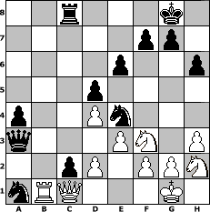 Partie-Notation im PGN-Format [Event "Bobby Fischer lebt Teil 2"] [Site "www.mySchach.de"] [Date "2009.09.02"] [Round "1"] [White "reisinger"] [Black "ujack1961"] [ECO "D35"] [WhitemyELO "1489"] [BlackmyELO "1703"] [Result "0-1"] [TimeControl "10/2592000"] [WhiteDays "120"] [BlackDays "120"] [MySchachNr "58757"] 1. d4 d5 2. c4 e6 3. Nc3 Nf6 4. Qc2 c6 5. Bf4 Bd6 6. Bxd6 Qxd6 7. c5 Qc7 8. Nf3 O-O 9. e3 b6 10. b4 bxc5 11. bxc5 a5 12. Bd3 h6 13. O-O Ba6 14. Bxa6 Nxa6 15. Rab1 Rab8 16. Na4 Rb4 17. a3 Rc4 18. Qd1 Rb8 19. Nb6 Ne4 20. Rb3 Naxc5 21. Nxc4 Nxb3 22. Nce5 c5 23. Qc2 c4 24. Rb1 a4 25. h3 Rc8 26. Ng4 Qd6 27. Qb2 c3 28. Qc2 Qxa3 29. Ngh2 Na1 30. Qc1 c2 0-1 Stellungs-Notation im FEN-Format 2r3k1/5pp1/4p2p/3p4/p2Pn3/q3PN1P/2pP1PPN/nRQ3K1 - - - 0 31 Geschlagene Figuren Weiss: Geschlagene Figuren Schwarz: Klicken Sie auf eine geschlagene Figur um den gewünschten Zug darzustellen!