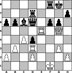 Partie-Notation im PGN-Format [Event "Wrixum - Open die XII"] [Site "www.mySchach.de"] [Date "2014.10.09"] [Round "1"] [White "martinus"] [Black "Seneca"] [ECO "A41"] [WhitemyELO "1735"] [BlackmyELO "1515"] [Result "0-1"] [TimeControl "10/2592000"] [WhiteDays "116"] [BlackDays "057"] [MySchachNr "96282"] 1. d4 d6 2. e4 Nf6 3. Nc3 Nbd7 4. Nf3 c5 5. Bb5 cxd4 6. Nxd4 a6 7. Bxd7+ Nxd7 8. O-O g6 9. Nd5 Bg7 10. Bg5 Nf6 11. Re1 O-O 12. e5 Nxd5 13. exd6 Qxd6 14. c4 Nf6 15. Be3 Ng4 16. g3 Nxe3 17. fxe3 b6 18. Qf3 Bd7 19. Rad1 Qc7 20. b3 Bxd4 21. exd4 e6 22. d5 Qc5+ 23. Kf1 exd5 24. Kg2 d4 25. Qf4 Bc6+ 26. Kf1 Rad8 27. Re5 Qd6 28. Rd3 Rd7 29. Qg5 f6 0-1 Stellungs-Notation im FEN-Format 5rk1/3r3p/ppbq1pp1/4R1Q1/2Pp4/1P1R2P1/P2P3P/5K2 - - - 0 30 Geschlagene Figuren Weiss: Geschlagene Figuren Schwarz: Klicken Sie auf eine geschlagene Figur um den gewünschten Zug darzustellen!