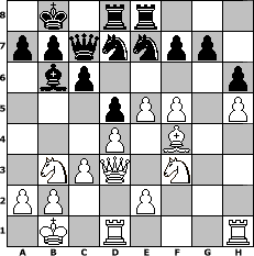 Partie-Notation im PGN-Format [Event "MNX1"] [Site "www.mySchach.de"] [Date "2015.03.13"] [Round "1"] [White "martinus"] [Black "clemensfritz"] [ECO "B12"] [WhitemyELO "1742"] [BlackmyELO "1542"] [Result "1-0"] [TimeControl "10/2592000"] [WhiteDays "30"] [BlackDays "30"] [MySchachNr "98518"] 1. e4 c6 2. d4 d5 3. e5 Bf5 4. g4 Bg6 5. h4 h6 6. h5 Bh7 7. f4 e6 8. Nf3 Bb4+ 9. c3 Ba5 10. Bd3 Bxd3 11. Qxd3 Nd7 12. Be3 Bb6 13. Nbd2 Ne7 14. O-O-O Qc7 15. f5 O-O-O 16. Nb3 Kb8 17. Kb1 exf5 18. gxf5 Rhe8 19. Bf4 1-0 Stellungs-Notation im FEN-Format 1k1rr3/ppqnnpp1/1bp4p/3pPP1P/3P1B2/1NPQ1N2/PP2P3/1K1R3R - - - 2 19 Geschlagene Figuren Weiss: Geschlagene Figuren Schwarz: Klicken Sie auf eine geschlagene Figur um den gewünschten Zug darzustellen!
