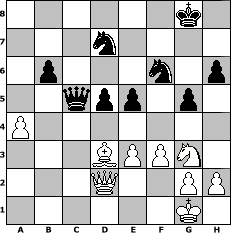 Partie-Notation im PGN-Format [Event "Weihnachtstunier"] [Site "www.mySchach.de"] [Date "2005.12.14"] [Round "1"] [White "Phantasos"] [Black "Pater"] [ECO "?"] [WhitemyELO "1994"] [BlackmyELO "1914"] [Result "1/2-1/2"] [TimeControl "10/864000"] [WhiteDays "06"] [BlackDays "10"] [MySchachNr "20772"] 1. d4 Nf6 2. c4 e6 3. Nc3 d5 4. cxd5 exd5 5. Bg5 c6 6. e3 Be7 7. Bd3 O-O 8. Qc2 Nbd7 9. Nge2 h6 10. Bh4 Re8 11. O-O Bd6 12. Rac1 Qe7 13. Rfe1 Nf8 14. Bg3 Bxg3 15. Nxg3 Be6 16. Nce2 Qc7 17. Nf4 a5 18. a4 Qb6 19. Qc3 N8d7 20. Rb1 Qb4 21. Bc2 Qe7 22. Rec1 Rec8 23. b4 axb4 24. Rxb4 b6 25. Rb2 c5 26. Rcb1 Rc7 27. Nge2 Rac8 28. Qa3 Qe8 29. dxc5 Rxc5 30. Bd3 g5 31. Nxe6 fxe6 32. Rb4 Qf7 33. Qb2 Qe7 34. Qd2 Qd6 35. f3 e5 36. Ng3 Rc1+ 37. Rxc1 Rxc1+ 38. Qxc1 Qxb4 39. Qc8+ Qf8 40. Qc3 Qc5 41. Qd2 1/2-1/2 Stellungs-Notation im FEN-Format 6k1/3n4/1p3n1p/2qpp1p1/P7/3BPPN1/3Q2PP/6K1 - - - 5 41 Geschlagene Figuren Weiss: Geschlagene Figuren Schwarz: Klicken Sie auf eine geschlagene Figur um den gewünschten Zug darzustellen!