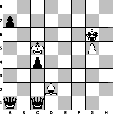 Partie-Notation im PGN-Format [Event "1.Schaltjahresturnier@mySchach"] [Site "www.mySchach.de"] [Date "2004.02.29"] [Round "1"] [White "carlo"] [Black "dennis2004"] [ECO "B01"] [WhitemyELO "1491"] [BlackmyELO "1510"] [Result "0-1"] [TimeControl "10/1728000"] [WhiteDays "135"] [BlackDays "094"] [MySchachNr "2631"] 1. e4 d5 2. Nc3 d4 3. Nd5 c6 4. Nf4 e5 5. Nh5 g6 6. Ng3 Bg7 7. Bc4 Nf6 8. c3 c5 9. Bb3 O-O 10. Qe2 b6 11. h4 Bb7 12. h5 Qd6 13. f4 Re8 14. Qc4 Qc7 15. h6 Bh8 16. f5 Nxe4 17. N3e2 gxf5 18. d3 Nd6 19. Qa4 Bc6 20. Qa3 Nb5 21. Qa4 Nxc3 22. Qc4 Bb5 23. Qxf7+ Qxf7 24. Bxf7+ Kxf7 25. bxc3 Bxd3 26. Ng3 Nc6 27. Nf3 Kg6 28. Rh5 f4 29. Rg5+ Kxh6 30. Rh5+ Kg6 31. Nh4+ Kg7 32. Nhf5+ Bxf5 33. Nxf5+ Kg6 34. Rh6+ Kxf5 35. Rxc6 Bf6 36. Rc7 Re7 37. Rc6 Re6 38. Rc7 Kg6 39. a4 dxc3 40. a5 Ree8 41. Kf2 Bd8 42. Rd7 bxa5 43. Ba3 Bb6 44. Rad1 Rad8 45. R1d6+ Kf5 46. Kf3 Rxd7 47. Rxd7 c2 48. Rxh7 Rg8 49. g4+ Kg5 50. Rh5+ Kf6 51. Rf5+ Kg6 52. Rxe5 Kf7 53. Kxf4 Rg6 54. g5 Re6 55. Kf5 Rxe5+ 56. Kxe5 Kg6 57. Kf4 c4 58. Bb2 Bc5 59. Bc1 a4 60. Ke5 a3 61. Kd5 a2 62. Kxc5 a1=Q 63. Bd2 c1=Q 0-1 Stellungs-Notation im FEN-Format 8/p7/6k1/2K3P1/2p5/8/3B4/q1q5 - - - 0 64 Geschlagene Figuren Weiss: ![]() ![]() ![]() ![]() ![]() ![]() ![]() ![]() ![]() ![]() ![]() ![]() ![]() ![]() ![]() Geschlagene Figuren Schwarz: ![]() ![]() ![]() ![]() ![]() ![]() ![]() ![]() ![]() ![]() ![]() ![]() ![]() ![]() ![]() Klicken Sie auf eine geschlagene Figur um den gewünschten Zug darzustellen!
