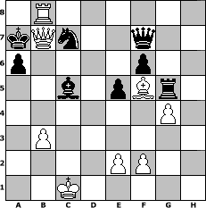 Partie-Notation im PGN-Format [Event "Thera"] [Site "www.mySchach.de"] [Date "2025.07.03"] [Round "1"] [White "Hobbykegler"] [Black "borsti"] [ECO "C41"] [WhitemyELO "1036"] [BlackmyELO "1154"] [Result "1-0"] [TimeControl "10/2592000"] [WhiteDays "091"] [BlackDays "137"] [MySchachNr "133477"] 1. e4 e5 2. Nf3 d6 3. Nc3 Bg4 4. h3 Bxf3 5. Qxf3 a6 6. d3 h6 7. g4 g5 8. Rg1 Ne7 9. Nd5 Nxd5 10. exd5 Nd7 11. Be3 Qf6 12. Qe4 O-O-O 13. c4 Qg7 14. O-O-O Nf6 15. Qf5+ Kb8 16. b3 Be7 17. a4 Qh7 18. Qf3 h5 19. gxh5 Nxh5 20. Qg4 Rhg8 21. Bg2 f6 22. Qe6 Rgf8 23. Be4 Qf7 24. Qf5 Ng7 25. Qf3 Rh8 26. d4 Rh4 27. Rg4 Rdh8 28. Rh1 R8h5 29. Bxg5 Rxg4 30. hxg4 Rxg5 31. Rh8+ Ka7 32. Rc8 Ne8 33. a5 b6 34. axb6+ Kb7 35. Bf5 Bf8 36. c5 dxc5 37. dxc5 Bxc5 38. d6+ Kxb6 39. dxc7 Nxc7 40. Rb8+ Ka7 41. Qb7# 1-0 Stellungs-Notation im FEN-Format 1R6/kQn2q2/p4p2/2b1pBr1/6P1/1P6/4PP2/2K5 - - - 3 41 Geschlagene Figuren Weiss: Geschlagene Figuren Schwarz: Klicken Sie auf eine geschlagene Figur um den gewünschten Zug darzustellen!