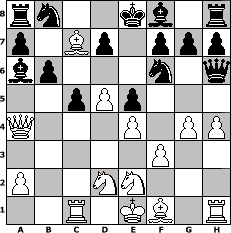 Partie-Notation im PGN-Format [Event "Zum Sommeranfang"] [Site "www.mySchach.de"] [Date "2017.06.11"] [Round "1"] [White "larlinde"] [Black "Helmut48"] [ECO "A45"] [WhitemyELO "2133"] [BlackmyELO "2049"] [Result "1-0"] [TimeControl "10/2592000"] [WhiteDays "27"] [BlackDays "60"] [MySchachNr "108545"] 1. d4 Nf6 2. Bg5 Ne4 3. Bf4 c5 4. f3 Qa5+ 5. c3 Nf6 6. d5 Qb6 7. e4 Qxb2 8. Nd2 Qxc3 9. Bc7 b6 10. Rc1 Qe3+ 11. Ne2 Ba6 12. Qa4 Qh6 13. g4 e5 14. h4 1-0 Stellungs-Notation im FEN-Format rn2kb1r/p1Bp1ppp/bp3n1q/2pPp3/Q3P1PP/5P2/P2NN3/2R1KB1R - Kkq - 0 14 Geschlagene Figuren Weiss: Geschlagene Figuren Schwarz: Klicken Sie auf eine geschlagene Figur um den gewünschten Zug darzustellen!