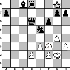 Partie-Notation im PGN-Format [Event "Sweety Tunier"] [Site "www.mySchach.de"] [Date "2006.02.28"] [Round "1"] [White "icke"] [Black "AlbertoAveiro"] [ECO "A45"] [WhitemyELO "1355"] [BlackmyELO "1517"] [Result "0-1"] [TimeControl "10/2592000"] [WhiteDays "114"] [BlackDays "064"] [MySchachNr "22939"] 1. d4 Nf6 2. e3 d5 3. Qf3 Nc6 4. Nc3 e5 5. dxe5 Nxe5 6. Qf4 Bd6 7. Bb5+ Bd7 8. Qh4 Ng6 9. Qg5 c6 10. Bd3 Be7 11. Nf3 Ne4 12. Qh5 Nf6 13. Qg5 Ne4 14. Bxe4 Bxg5 15. Nxd5 cxd5 16. Bxd5 O-O 17. O-O Bf6 18. Bxb7 Rb8 19. Ba6 Bxb2 20. Bxb2 Qb6 21. Rfb1 Qxa6 22. h3 Bf5 23. Be5 Rxb1+ 24. Rxb1 Qxa2 25. Rb5 Qxc2 26. Bd6 Rd8 27. Rc5 Qd1+ 28. Kh2 Qxd6+ 29. Re5 f6 30. g4 Bc8 31. Kg2 Nxe5 0-1 Stellungs-Notation im FEN-Format 2br2k1/p5pp/3q1p2/4n3/6P1/4PN1P/3P1PK1/8 - - - 0 32 Geschlagene Figuren Weiss: Geschlagene Figuren Schwarz: Klicken Sie auf eine geschlagene Figur um den gewünschten Zug darzustellen!