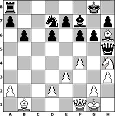 Partie-Notation im PGN-Format [Event "Sonnenschein und Blumen"] [Site "www.mySchach.de"] [Date "2010.02.18"] [Round "1"] [White "reisinger"] [Black "Joschi"] [ECO "A56"] [WhitemyELO "1469"] [BlackmyELO "1559"] [Result "0-1"] [TimeControl "10/2592000"] [WhiteDays "30"] [BlackDays "30"] [MySchachNr "63433"] 1. d4 Nf6 2. c4 c5 3. Bf4 cxd4 4. Qxd4 Nc6 5. Qd1 d6 6. h3 g6 7. Nc3 Bg7 8. e3 Qa5 9. Qc2 Bf5 10. Qb3 b6 11. Nf3 Ne4 12. Rc1 Nxc3 13. Rxc3 Bxc3+ 14. bxc3 O-O 15. Nh4 Be6 16. Bd3 Rfc8 17. O-O f6 18. Bh6 Ne5 19. Bb1 Bxc4 20. Qc2 Bf7 21. f4 Rxc3 22. Qe2 Nd7 23. Rf3 Rc1+ 24. Rf1 Rxf1+ 25. Qxf1 Qh5 0-1 Stellungs-Notation im FEN-Format r5k1/p2npb1p/1p1p1ppB/7q/5P1N/4P2P/P2P2P1/1B3QK1 - - - 1 26 Geschlagene Figuren Weiss: Geschlagene Figuren Schwarz: Klicken Sie auf eine geschlagene Figur um den gewünschten Zug darzustellen!