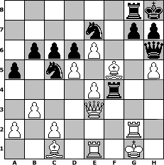 Partie-Notation im PGN-Format [Event "Die Eisenbahner sind wieder da!!"] [Site "www.mySchach.de"] [Date "2016.09.09"] [Round "1"] [White "larlinde"] [Black "muetoe"] [Variant "Fischerrandom"] [SetUp "1"] [FEN "bnnrqbkr/pppppppp/8/8/8/8/PPPPPPPP/BNNRQBKR w KQkq - 0 1"] [WhitemyELO "2146"] [BlackmyELO "1966"] [Result "1-0"] [TimeControl "10/1728000"] [WhiteDays "38"] [BlackDays "58"] [MySchachNr "104847"] 1. c4 e5 2. Nc3 b6 3. b3 Bd6 4. d4 exd4 5. Rxd4 f6 6. e3 a6 7. Rd1 O-O 8. Bb2 Qg6 9. Nd5 Nc6 10. h4 N6e7 11. h5 Qh6 12. Nc3 Rde8 13. Rh3 Nc6 14. Be2 Nd8 15. Nd3 Nf7 16. f4 f5 17. Nd5 Nd8 18. g4 fxg4 19. Rg3 Bxd5 20. cxd5 Rf7 21. Bxg4 Nb7 22. Ne5 Bxe5 23. fxe5 Nc5 24. Rg2 a5 25. Qe2 Kh8 26. e4 Rf4 27. e6 d6 28. Bc1 Rg8 29. Bf5 Ne7 30. Re1 c6 31. Qe3 1-0 Stellungs-Notation im FEN-Format 6rk/4n1pp/1pppP2q/p1nP1B1P/4Pr2/1P2Q3/P1P3R1/2B1R1K1 - - - 1 31 Geschlagene Figuren Weiss: Geschlagene Figuren Schwarz: Klicken Sie auf eine geschlagene Figur um den gewünschten Zug darzustellen!