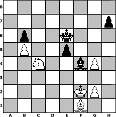 Partie-Notation im PGN-Format [Event "Turnier zum Winterende"] [Site "www.mySchach.de"] [Date "2006.02.18"] [Round "2"] [White "nogumo"] [Black "blotto"] [ECO "A00"] [WhitemyELO "1666"] [BlackmyELO "1609"] [Result "1-0"] [TimeControl "10/2592000"] [WhiteDays "146"] [BlackDays "081"] [MySchachNr "22630"] 1. b4 Nf6 2. Bb2 e6 3. b5 d5 4. e3 a6 5. a4 axb5 6. axb5 Rxa1 7. Bxa1 c5 8. c4 Bd7 9. Nf3 Qa5 10. Bc3 Qb6 11. Ne5 dxc4 12. Nxd7 Nbxd7 13. Bxc4 Bd6 14. O-O O-O 15. Qc2 Ne5 16. Be2 Ra8 17. d4 cxd4 18. Bxd4 Qc7 19. Qb2 Neg4 20. h3 Bh2+ 21. Kh1 Bg1 22. f4 Bxe3 23. hxg4 Bxf4 24. Bxf6 gxf6 25. Qxf6 Bg3 26. Nd2 Ra2 27. Qg5+ Kh8 28. Qh6 Qd8 29. Rxf7 Qh4+ 30. Qxh4 Bxh4 31. Nf3 Bg3 32. Bf1 Rf2 33. Kg1 b6 34. Ng5 Rxf7 35. Nxf7+ Kg7 36. Ng5 e5 37. Ne4 Bf4 38. Kf2 Kf7 39. Nd6+ Ke6 40. Nc4 1-0 Stellungs-Notation im FEN-Format 8/7p/1p2k3/1P2p3/2N2bP1/8/5KP1/5B2 - - - 7 40 Geschlagene Figuren Weiss: Geschlagene Figuren Schwarz: Klicken Sie auf eine geschlagene Figur um den gewünschten Zug darzustellen!