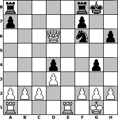 Partie-Notation im PGN-Format [Event "Turnier zum Winterende"] [Site "www.mySchach.de"] [Date "2006.02.18"] [Round "1"] [White "romain63"] [Black "Knight"] [ECO "C42"] [WhitemyELO "1802"] [BlackmyELO "1226"] [Result "1-0"] [TimeControl "10/2592000"] [WhiteDays "90"] [BlackDays "86"] [MySchachNr "22607"] 1. e4 e5 2. Nf3 Nf6 3. Nxe5 d6 4. Nf3 Nxe4 5. d3 Nf6 6. Be2 Bg4 7. O-O Nc6 8. Re1 Be7 9. Bg5 Bxf3 10. Bxf3 O-O 11. Bxc6 bxc6 12. Nc3 h6 13. Bh4 g5 14. Bg3 d5 15. Qf3 Bb4 16. Be5 Bxc3 17. Bxc3 d4 18. Bb4 g4 19. Qxc6 Qd6 20. Bxd6 cxd6 21. Qxd6 1-0 Stellungs-Notation im FEN-Format r4rk1/p4p2/3Q1n1p/8/3p2p1/3P4/PPP2PPP/R3R1K1 - - - 0 21 Geschlagene Figuren Weiss: Geschlagene Figuren Schwarz: Klicken Sie auf eine geschlagene Figur um den gewünschten Zug darzustellen!