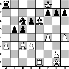 Partie-Notation im PGN-Format [Event "Orang - Utan"] [Site "www.mySchach.de"] [Date "2012.03.06"] [Round "1"] [White "Haki"] [Black "Andylein1989"] [ECO "A00"] [WhitemyELO "1312"] [BlackmyELO "1562"] [Result "0-1"] [TimeControl "10/2592000"] [WhiteDays "90"] [BlackDays "55"] [MySchachNr "80339"] 1. b4 e5 2. Bb2 Bxb4 3. Bxe5 Nf6 4. c4 d6 5. Bb2 O-O 6. a3 Ba5 7. Nc3 c6 8. e4 Re8 9. Bd3 Bxc3 10. Bxc3 Nxe4 11. Bxe4 Rxe4+ 12. Ne2 Qe7 13. d3 Re6 14. O-O Rxe2 15. Re1 Rxe1+ 16. Qxe1 Qxe1+ 17. Rxe1 Kf8 18. Bd2 Be6 19. Bb4 c5 20. Bc3 Nc6 21. h4 a6 22. f4 b5 23. cxb5 axb5 0-1 Stellungs-Notation im FEN-Format r4k2/5ppp/2npb3/1pp5/5P1P/P1BP4/6P1/4R1K1 - - - 0 24 Geschlagene Figuren Weiss: Geschlagene Figuren Schwarz: Klicken Sie auf eine geschlagene Figur um den gewünschten Zug darzustellen!