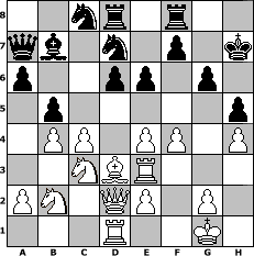 Partie-Notation im PGN-Format [Event "Die Eisenbahner sind wieder da!!"] [Site "www.mySchach.de"] [Date "2016.09.09"] [Round "1"] [White "Erich"] [Black "larlinde"] [Variant "Fischerrandom"] [SetUp "1"] [FEN "bnnrqbkr/pppppppp/8/8/8/8/PPPPPPPP/BNNRQBKR w KQkq - 0 1"] [WhitemyELO "2117"] [BlackmyELO "2146"] [Result "1/2-1/2"] [TimeControl "10/1728000"] [WhiteDays "60"] [BlackDays "21"] [MySchachNr "104844"] 1. e4 b6 2. Nc3 h5 3. h4 e6 4. b3 Bb7 5. Bb2 c5 6. d4 cxd4 7. Rxd4 g6 8. Rd1 Bg7 9. Rh3 Qe7 10. Nd3 d6 11. Nb5 Bxb2 12. Nxb2 O-O 13. c4 Nd7 14. Nc3 Qf6 15. Qd2 Nc5 16. Re1 Ne7 17. b4 Nd7 18. Nb5 Nc8 19. f4 Kh7 20. Bd3 a6 21. Nc3 Qd4+ 22. Re3 b5 23. Rd1 Qa7 1/2-1/2 Stellungs-Notation im FEN-Format 2nr1r2/qb1n1p1k/p2pp1p1/1p5p/1PP1PP1P/2NBR3/PN1QP1P1/3R2K1 - - - 2 24 Geschlagene Figuren Weiss: Geschlagene Figuren Schwarz: Klicken Sie auf eine geschlagene Figur um den gewünschten Zug darzustellen!