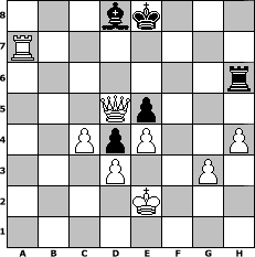 Partie-Notation im PGN-Format [Event "Chess for beginners"] [Site "www.mySchach.de"] [Date "2006.09.27"] [Round "1"] [Board "2"] [White "Sherlock6834"] [Black "AG666"] [ECO "C40"] [WhitemyELO "1587"] [BlackmyELO "1482"] [Result "1-0"] [TimeControl "10/2592000"] [WhiteDays "30"] [BlackDays "20"] [MySchachNr "28966"] 1. e4 e5 2. Nf3 Qf6 3. Bc4 Bc5 4. O-O d6 5. h3 a6 6. a4 Ne7 7. Nc3 Be6 8. Qe2 Nbc6 9. d3 h6 10. Nd5 O-O-O 11. Nxf6 gxf6 12. Bxe6+ fxe6 13. Be3 Nd4 14. Bxd4 exd4 15. Rab1 e5 16. b4 Ba7 17. b5 a5 18. Qd2 b6 19. c4 Ng6 20. Nh2 Nf4 21. Ng4 Rdf8 22. f3 h5 23. Nf2 Rhg8 24. Kh1 Rg7 25. Rg1 Kd7 26. g3 Ne6 27. Qh6 Rg5 28. f4 Rgg8 29. Qxh5 Rh8 30. Qf3 Ke7 31. Kg2 Rfg8 32. Kf1 Nc5 33. fxe5 dxe5 34. Qd1 Kd6 35. Rb2 c6 36. h4 Bb8 37. bxc6 Kxc6 38. Rb5 Rg7 39. Ke2 Bd6 40. Qb1 Nxa4 41. Nd1 Rb7 42. Rd5 Nc5 43. Qb5+ Kc7 44. Nf2 a4 45. Ng4 Be7 46. Rb1 a3 47. Ra1 Ra7 48. Nxf6 Bxf6 49. Rxc5+ bxc5 50. Qxc5+ Kd7 51. Qxa7+ Ke8 52. Rxa3 Be7 53. Qa8+ Bd8 54. Ra7 Rh6 55. Qd5 1-0 Stellungs-Notation im FEN-Format 3bk3/R7/7r/3Qp3/2PpP2P/3P2P1/4K3/8 - - - 6 55 Geschlagene Figuren Weiss: Geschlagene Figuren Schwarz: Klicken Sie auf eine geschlagene Figur um den gewünschten Zug darzustellen!