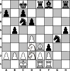 Partie-Notation im PGN-Format [Event "\" Gehirn Jogging A 2 \""] [Site "www.mySchach.de"] [Date "2011.12.23"] [Round "1"] [White "Vahl1"] [Black "BobbyF4"] [ECO "C40"] [WhitemyELO "1583"] [BlackmyELO "1463"] [Result "1/2-1/2"] [TimeControl "10/1728000"] [WhiteDays "20"] [BlackDays "20"] [MySchachNr "78488"] 1. e4 e5 2. Nf3 f5 3. Nxe5 Qf6 4. d4 d6 5. Nc4 fxe4 6. Nc3 Qg6 7. h3 Nf6 8. Ne3 Be6 9. Bc4 Bxc4 10. Nxc4 Qxg2 11. Rf1 Nc6 12. Nd5 O-O-O 13. Nf4 Qf3 14. Qxf3 exf3 15. Be3 Re8 16. O-O-O b5 17. Nd2 g5 18. Nd3 g4 19. hxg4 Nxg4 20. Rde1 h5 1/2-1/2 Stellungs-Notation im FEN-Format 2k1rb1r/p1p5/2np4/1p5p/3P2n1/3NBp2/PPPNPP2/2K1RR2 - - - 0 21 Geschlagene Figuren Weiss: Geschlagene Figuren Schwarz: Klicken Sie auf eine geschlagene Figur um den gewünschten Zug darzustellen!