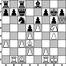 Partie-Notation im PGN-Format [Event "Ein ganz normales"] [Site "www.mySchach.de"] [Date "2007.05.28"] [Round "2"] [White "kischok46"] [Black "Juliette2103"] [ECO "A40"] [WhitemyELO "1939"] [BlackmyELO "1433"] [Result "1-0"] [TimeControl "10/2592000"] [WhiteDays "90"] [BlackDays "27"] [MySchachNr "35209"] 1. d4 e6 2. e4 d5 3. e5 c5 4. c3 Nc6 5. Nf3 Qb6 6. Be2 cxd4 7. cxd4 Bb4+ 8. Nc3 Nge7 9. a3 Bxc3+ 10. bxc3 O-O 11. O-O Bd7 12. Bd3 Ng6 13. Rb1 Qc7 14. h4 Rfc8 15. h5 Nge7 16. h6 g6 17. Ng5 Nf5 18. g4 Nxh6 19. Qf3 Be8 20. Qh3 Kg7 21. Qxh6+ 1-0 Stellungs-Notation im FEN-Format r1r1b3/ppq2pkp/2n1p1pQ/3pP1N1/3P2P1/P1PB4/3P1P2/1RB2RK1 - - - 0 21 Geschlagene Figuren Weiss: Geschlagene Figuren Schwarz: Klicken Sie auf eine geschlagene Figur um den gewünschten Zug darzustellen!