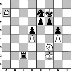 Partie-Notation im PGN-Format [Event "Herbstturnier 2022"] [Site "www.mySchach.de"] [Date "2022.09.26"] [Round "2"] [White "beowulf"] [Black "Mynona"] [ECO "A03"] [WhitemyELO "1508"] [BlackmyELO "1445"] [Result "1/2-1/2"] [TimeControl "10/1728000"] [WhiteDays "120"] [BlackDays "120"] [MySchachNr "127303"] 1. f4 d5 2. Nf3 Bf5 3. e3 e6 4. Nc3 a6 5. d4 c5 6. Be2 c4 7. O-O Nf6 8. b3 b5 9. Bb2 Ne4 10. bxc4 bxc4 11. Nxe4 Bxe4 12. Ne5 f6 13. Nf3 Qb6 14. Rb1 Qa5 15. Nd2 Bg6 16. Nf3 Qxa2 17. Qc1 Qa4 18. Bd1 Qd7 19. Ra1 Be7 20. Ba3 O-O 21. c3 Bxa3 22. Rxa3 Qf7 23. Bc2 Nd7 24. Bxg6 Qxg6 25. Qa1 Rf7 26. Rxa6 Rxa6 27. Qxa6 Qe4 28. Qc8+ Nf8 29. Re1 Qc2 30. h3 Qxc3 31. Rb1 Qxe3+ 32. Kh1 Qxf4 33. Rb6 Qc7 34. Qa6 c3 35. Rc6 Qb7 36. Qxb7 Rxb7 37. Rxc3 g5 38. g4 h6 39. Kg2 Ng6 40. Kg3 Kf7 41. Rc5 Nf4 42. h4 Ng6 43. hxg5 hxg5 44. Ne1 Rb1 45. Nf3 Rb3 46. Kf2 Rb4 47. Ke3 Rc4 48. Ra5 Rc3+ 49. Kf2 Rc2+ 50. Kg3 Rc3 51. Ra7+ Ne7 52. Kf2 Rc2+ 1/2-1/2 Stellungs-Notation im FEN-Format 8/R3nk2/4pp2/3p2p1/3P2P1/5N2/2r2K2/8 - - - 18 53 Geschlagene Figuren Weiss: Geschlagene Figuren Schwarz: Klicken Sie auf eine geschlagene Figur um den gewünschten Zug darzustellen!