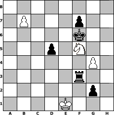 Partie-Notation im PGN-Format [Event "4. Windeck Open"] [Site "www.mySchach.de"] [Date "2011.06.29"] [Round "1"] [White "sprinterde"] [Black "espero"] [ECO "C00"] [WhitemyELO "1679"] [BlackmyELO "1627"] [Result "0-1"] [TimeControl "10/864000"] [WhiteDays "58"] [BlackDays "59"] [MySchachNr "74836"] 1. e4 e6 2. Nf3 d5 3. exd5 exd5 4. Qe2+ Be7 5. Qe3 Nf6 6. Bb5+ c6 7. Bd3 O-O 8. O-O Re8 9. Qf4 c5 10. Bb5 Bd7 11. a4 a6 12. Bxd7 Qxd7 13. d4 Nc6 14. Ne5 Qe6 15. Nxc6 bxc6 16. Be3 Bd6 17. Qf3 Ng4 18. Bf4 Bxf4 19. Qxf4 cxd4 20. Qxd4 Rab8 21. h3 Nf6 22. Nd2 h6 23. b3 c5 24. Qxc5 Rbc8 25. Qa5 Rxc2 26. Nf3 Qc8 27. Rad1 Rc3 28. Nd4 g6 29. b4 Re4 30. f3 Re5 31. f4 Re4 32. f5 g5 33. Qb6 Kg7 34. a5 Rc4 35. b5 axb5 36. Nxb5 Qc5+ 37. Kh1 Re2 38. Nd6 Qxb6 39. axb6 Rb4 40. Rb1 Reb2 41. Rxb2 Rxb2 42. Nc8 h5 43. Rc1 h4 44. Rc6 Rb1+ 45. Kh2 Ne4 46. f6+ Kh6 47. g4 hxg3+ 48. Kg2 Rb2+ 49. Kg1 Nf2 50. Kg2 Ne4+ 51. Kf1 g4 52. hxg4 Ng5 53. Rc3 Rf2+ 54. Ke1 Nf3+ 55. Rxf3 Rxf3 56. Nd6 Kg6 57. Nf5 Kxf6 58. b7 g2 0-1 Stellungs-Notation im FEN-Format 8/1P3p2/5k2/3p1N2/6P1/5r2/6p1/4K3 - - - 0 59 Geschlagene Figuren Weiss: Geschlagene Figuren Schwarz: Klicken Sie auf eine geschlagene Figur um den gewünschten Zug darzustellen!