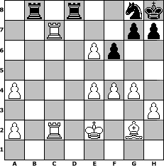 Partie-Notation im PGN-Format [Event "Wargames-kill the King III"] [Site "www.mySchach.de"] [Date "2006.08.14"] [Round "1"] [White "ujack1961"] [Black "MartinSilies"] [ECO "D09"] [WhitemyELO "1609"] [BlackmyELO "1503"] [Result "1-0"] [TimeControl "10/864000"] [WhiteDays "10"] [BlackDays "05"] [MySchachNr "27687"] 1. d4 d5 2. c4 e5 3. dxe5 d4 4. Nf3 Nc6 5. g3 Bb4+ 6. Bd2 Qe7 7. Bg2 Nh6 8. Bxb4 Qxb4+ 9. Qd2 Qxd2+ 10. Nbxd2 Ng4 11. Nb3 Be6 12. Nbxd4 Bxc4 13. Nxc6 bxc6 14. h3 Nh6 15. Nd4 Bd5 16. e4 Bc4 17. Nxc6 O-O 18. f4 Bb5 19. Ne7+ Kh8 20. Rc1 c6 21. Kf2 Rfe8 22. Nxc6 Bxc6 23. Rxc6 Rab8 24. b3 Red8 25. Ke2 a5 26. Rhc1 a4 27. bxa4 Rb2+ 28. R6c2 Rb4 29. Rc4 Rb2+ 30. R1c2 Rbb8 31. g4 Ng8 32. Rc7 f6 33. e6 1-0 Stellungs-Notation im FEN-Format 1r1r2nk/2R3pp/4Pp2/8/P3PPP1/7P/P1R1K1B1/8 - - - 0 33 Geschlagene Figuren Weiss: Geschlagene Figuren Schwarz: Klicken Sie auf eine geschlagene Figur um den gewünschten Zug darzustellen!