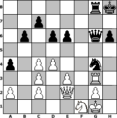 Partie-Notation im PGN-Format [Event "Bremer Schl"] [Site "www.mySchach.de"] [Date "2008.11.01"] [Round "1"] [White "muetoe"] [Black "HenrySchinasky"] [ECO "A15"] [WhitemyELO "1940"] [BlackmyELO "2045"] [Result "1/2-1/2"] [TimeControl "10/2592000"] [WhiteDays "111"] [BlackDays "104"] [MySchachNr "49414"] 1. c4 Nf6 2. Nf3 e6 3. d4 b6 4. Nc3 Bb7 5. Bf4 Bb4 6. Qb3 a5 7. e3 Ne4 8. Bd3 d6 9. O-O Bxc3 10. bxc3 O-O 11. Rad1 Nd7 12. Nd2 Nef6 13. Bg5 a4 14. Qb1 h6 15. Bh4 g5 16. Bg3 Nh5 17. h3 Nxg3 18. fxg3 f5 19. g4 fxg4 20. Be2 Kg7 21. Bxg4 Qe7 22. Bh5 Kh8 23. Qg6 Qg7 24. Qd3 Nf6 25. Bf3 Bxf3 26. Rxf3 g4 27. hxg4 Nxg4 28. Rg3 Rg8 29. Rf1 Raf8 30. Qe2 Rxf1+ 31. Nxf1 Qg6 1/2-1/2 Stellungs-Notation im FEN-Format 6rk/2p5/1p1pp1qp/8/p1PP2n1/2P1P1R1/P1P1Q1P1/5NK1 - - - 1 32 Geschlagene Figuren Weiss: Geschlagene Figuren Schwarz: Klicken Sie auf eine geschlagene Figur um den gewünschten Zug darzustellen!