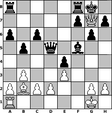 Partie-Notation im PGN-Format [Event "Open"] [Site "www.mySchach.de"] [Date "2016.01.17"] [Round "1"] [White "augustus"] [Black "lotchi"] [ECO "D00"] [WhitemyELO "1265"] [BlackmyELO "1059"] [Result "1-0"] [TimeControl "10/1728000"] [WhiteDays "60"] [BlackDays "57"] [MySchachNr "102153"] 1. d4 d5 2. e3 Nf6 3. f3 Nc6 4. Bb5 Bd7 5. Bxc6 Bxc6 6. Ne2 e6 7. Nbc3 Bb4 8. O-O Bxc3 9. Nxc3 O-O 10. b3 a6 11. Qe2 b5 12. f4 Ne4 13. Nxe4 dxe4 14. f5 exf5 15. Rxf5 g6 16. Qg4 Bd7 17. Qg5 Bxf5 18. Qh6 c6 19. Bb2 Qd6 20. d5 Qxd5 21. Qg7# 1-0 Stellungs-Notation im FEN-Format r4rk1/5pQp/p1p3p1/1p1q1b2/4p3/1P2P3/PBPP2PP/R5K1 - - - 1 21 Geschlagene Figuren Weiss: Geschlagene Figuren Schwarz: Klicken Sie auf eine geschlagene Figur um den gewünschten Zug darzustellen!