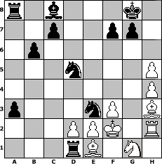 Partie-Notation im PGN-Format [Event "?"] [Site "www.mySchach.de"] [Date "2025.08.02"] [Round "?"] [White "Achimkogge"] [Black "spiderman"] [ECO "A45"] [WhitemyELO "1212"] [BlackmyELO "1753"] [Result "*"] [TimeControl "10/3456000"] [WhiteDays "40"] [BlackDays "36"] [MySchachNr "133560"] 1. d4 Nf6 2. c3 d5 3. f3 Nc6 4. g4 e5 5. dxe5 Nxe5 6. Bg5 Be7 7. Qa4+ Nfd7 8. Bf4 Ng6 9. Bg3 O-O 10. b4 d4 11. cxd4 Nb6 12. Qb3 Qxd4 13. Nc3 Bxb4 14. Rc1 Nd5 15. Bf2 Bxc3+ 16. Rxc3 Qxc3+ 17. Qxc3 Nxc3 18. Bc5 Rd8 19. a3 Rd1+ 20. Kf2 b6 21. Bb4 Nd5 22. Be1 Ne3 23. Bh3 Nc2 24. Bc3 Nxa3 25. Bb2 Nc4 26. Bc3 Nf4 27. Bf1 h5 28. gxh5 Nd5 29. Be1 Nce3 30. h3 a5 31. Rh2 a4 32. h4 a3 33. Bh3 * Stellungs-Notation im FEN-Format r1b3k1/2p2pp1/1p6/3n3P/7P/p3nP1B/3PPK1R/3rB1N1 b - - 1 33 Geschlagene Figuren Weiss: Geschlagene Figuren Schwarz: Klicken Sie auf eine geschlagene Figur um den gewünschten Zug darzustellen!