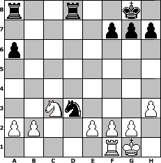 Partie-Notation im PGN-Format [Event "Chess Cafe Open 2016 1"] [Site "www.mySchach.de"] [Date "2016.11.02"] [Round "1"] [White "Joschi"] [Black "pepo47"] [ECO "B02"] [WhitemyELO "1594"] [BlackmyELO "2065"] [Result "0-1"] [TimeControl "10/2592000"] [WhiteDays "30"] [BlackDays "30"] [MySchachNr "105506"] 1. e4 Nf6 2. e5 Nd5 3. c4 Nb6 4. d4 d6 5. exd6 exd6 6. Nc3 Nc6 7. Be3 Be7 8. Nf3 Bg4 9. Bd3 Bf6 10. h3 Bxf3 11. Qxf3 Bxd4 12. Bxd4 Nxd4 13. Qxb7 O-O 14. O-O c6 15. Qa6 Ne6 16. Rad1 Nc5 17. Qa3 Nxd3 18. Rxd3 Nxc4 19. Qa6 d5 20. Qxc6 Ne5 21. Qb5 a6 22. Qxd5 Nxd3 23. Qxd8 Rfxd8 0-1 Stellungs-Notation im FEN-Format r2r2k1/5ppp/p7/8/8/2Nn3P/PP2PPP1/5RK1 - - - 0 24 Geschlagene Figuren Weiss: Geschlagene Figuren Schwarz: Klicken Sie auf eine geschlagene Figur um den gewünschten Zug darzustellen!