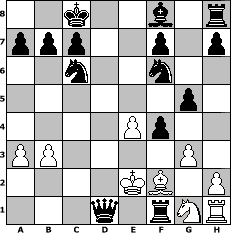 Partie-Notation im PGN-Format [Event "Freundschaftsturnier Vol.II"] [Site "www.mySchach.de"] [Date "2005.08.02"] [Round "1"] [White "FreshPrinc2"] [Black "Gno"] [ECO "A45"] [WhitemyELO "1259"] [BlackmyELO "1325"] [Result "0-1"] [TimeControl "10/864000"] [WhiteDays "10"] [BlackDays "10"] [MySchachNr "15822"] 1. d4 Nf6 2. Bf4 d6 3. Nd2 Nc6 4. e3 e5 5. dxe5 dxe5 6. Bg3 g5 7. f3 Be6 8. e4 Qd6 9. f4 exf4 10. Bf2 O-O-O 11. Qe2 Qb4 12. a3 Qxb2 13. Nb3 Bxb3 14. cxb3 Qxa1+ 15. Qd1 Rxd1+ 16. Ke2 Rxf1 17. g3 Qd1# 0-1 Stellungs-Notation im FEN-Format 2k2b1r/ppp2p1p/2n2n2/6p1/4Pp2/PP4P1/4KB1P/3q1rNR - - - 1 18 Geschlagene Figuren Weiss: Geschlagene Figuren Schwarz: Klicken Sie auf eine geschlagene Figur um den gewünschten Zug darzustellen!