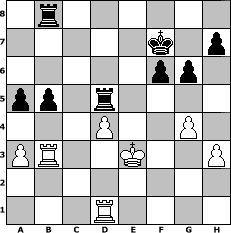 Partie-Notation im PGN-Format [Event "jetzt gehts los"] [Site "www.mySchach.de"] [Date "2007.06.30"] [Round "1"] [Board "4"] [White "Naunhofer"] [Black "Anonymus"] [ECO "E34"] [WhitemyELO "1719"] [BlackmyELO "1586"] [Result "1/2-1/2"] [TimeControl "10/1728000"] [WhiteDays "77"] [BlackDays "60"] [MySchachNr "36070"] 1. d4 Nf6 2. c4 e6 3. Nc3 Bb4 4. Qc2 d5 5. e3 c5 6. Bd3 dxc4 7. Bxc4 cxd4 8. exd4 Qxd4 9. Bb5+ Bd7 10. Be3 Qd5 11. Bxd7+ Nbxd7 12. Nf3 Qe4 13. Qb3 Nc5 14. Qd1 Bxc3+ 15. bxc3 Nd3+ 16. Kf1 Ng4 17. Bd4 O-O 18. Qe2 Qxe2+ 19. Kxe2 Nf4+ 20. Kd2 Rfd8 21. Kc2 Nd5 22. Rab1 Rdb8 23. h3 Ngf6 24. Ne5 a6 25. Rb3 Nc7 26. Rhb1 b5 27. f4 Rd8 28. g4 Nfd5 29. Nd3 f6 30. Rg1 Kf7 31. a3 a5 32. Kd2 Nxf4 33. Nxf4 e5 34. Ne2 exd4 35. Nxd4 Ne6 36. Ke3 Nxd4 37. cxd4 Rd5 38. Rgb1 Rb8 39. Rd1 g6 1/2-1/2 Stellungs-Notation im FEN-Format 1r6/5k1p/5pp1/pp1r4/3P2P1/PR2K2P/8/3R4 - - - 0 40 Geschlagene Figuren Weiss: Geschlagene Figuren Schwarz: Klicken Sie auf eine geschlagene Figur um den gewünschten Zug darzustellen!