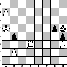 Partie-Notation im PGN-Format [Event "unter uns Nr. 19 (Osterturnier)"] [Site "www.mySchach.de"] [Date "2014.04.17"] [Round "1"] [White "Kyros537"] [Black "reisinger"] [ECO "D06"] [WhitemyELO "1471"] [BlackmyELO "1468"] [Result "1-0"] [TimeControl "10/864000"] [WhiteDays "60"] [BlackDays "60"] [MySchachNr "93974"] 1. d4 d5 2. c4 Nf6 3. e3 e6 4. Nc3 Bb4 5. Bd2 O-O 6. cxd5 Bxc3 7. Bxc3 Nxd5 8. Bd3 b6 9. Qf3 Bb7 10. Qe4 g6 11. O-O-O Nxc3 12. Qxb7 Nxd1 13. Kxd1 Nd7 14. Be4 c5 15. Qxa8 Qxa8 16. Bxa8 Rxa8 17. dxc5 Nxc5 18. Nf3 Rd8+ 19. Kc2 Ne4 20. Rf1 a5 21. Ne5 Rd2+ 22. Kb1 Rd5 23. Nc4 b5 24. f3 Nd2+ 25. Nxd2 Rxd2 26. Rg1 f5 27. e4 fxe4 28. fxe4 Re2 29. h3 Rxe4 30. Rc1 Re5 31. Rc7 Rd5 32. Re7 e5 33. Kc2 h5 34. Ra7 b4 35. Kb3 Kf8 36. Kc4 Rd4+ 37. Kb3 e4 38. Rxa5 Kg7 39. Rb5 e3 40. Re5 Rd2 41. Rxe3 Rxg2 42. a4 h4 43. Rd3 Rg3 44. Kc4 g5 45. a5 Rg1 46. a6 Ra1 47. Kb5 Kg6 48. Kb6 Kh5 49. a7 Ra5 50. Kxa5 1-0 Stellungs-Notation im FEN-Format 8/P7/8/K5pk/1p5p/3R3P/1P6/8 - - - 0 50 Geschlagene Figuren Weiss: ![]() ![]() ![]() ![]() ![]() ![]() ![]() ![]() ![]() ![]() ![]() ![]() ![]() ![]() ![]() Geschlagene Figuren Schwarz: ![]() ![]() ![]() ![]() ![]() ![]() ![]() ![]() ![]() ![]() ![]() ![]() ![]() ![]() ![]() Klicken Sie auf eine geschlagene Figur um den gewünschten Zug darzustellen!