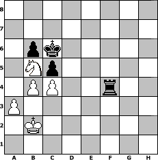 Partie-Notation im PGN-Format [Event "Ein ganz normales"] [Site "www.mySchach.de"] [Date "2007.05.28"] [Round "2"] [White "Caligula"] [Black "kischok46"] [ECO "A46"] [WhitemyELO "1773"] [BlackmyELO "1939"] [Result "1/2-1/2"] [TimeControl "10/2592000"] [WhiteDays "142"] [BlackDays "150"] [MySchachNr "35194"] 1. d4 Nf6 2. Nf3 d5 3. Bf4 Nbd7 4. e3 Nh5 5. Bg5 h6 6. Bh4 g5 7. Bg3 Nxg3 8. hxg3 Bg7 9. Nbd2 e5 10. Nxe5 Nxe5 11. dxe5 Bxe5 12. c3 c6 13. Nf3 Bf6 14. Be2 Bd7 15. Qb3 Qb6 16. Nd2 O-O-O 17. Qxb6 axb6 18. O-O-O Bg7 19. Nb3 f5 20. Nd4 b5 21. Bd3 Rhf8 22. b3 f4 23. gxf4 gxf4 24. exf4 Rxf4 25. f3 Rg8 26. Ne2 Rf6 27. Rd2 h5 28. Rxh5 Bh6 29. Rxh6 Rxh6 30. g4 Rh1+ 31. Kc2 Rf8 32. Nd4 c5 33. Nxb5 Rxf3 34. Bf5 Bxf5+ 35. gxf5 Kd7 36. Rxd5+ Kc6 37. c4 Rh2+ 38. Rd2 Rxd2+ 39. Kxd2 Rxf5 40. a3 Rf2+ 41. Kc3 b6 42. b4 Rf3+ 43. Kb2 Rf4 1/2-1/2 Stellungs-Notation im FEN-Format 8/8/1pk5/1Np5/1PP2r2/P7/1K6/8 - - - 3 44 Geschlagene Figuren Weiss: Geschlagene Figuren Schwarz: Klicken Sie auf eine geschlagene Figur um den gewünschten Zug darzustellen!