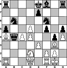 Partie-Notation im PGN-Format [Event "Ab in den Herbst"] [Site "www.mySchach.de"] [Date "2014.09.23"] [Round "1"] [White "espero"] [Black "alibengali"] [ECO "D00"] [WhitemyELO "1770"] [BlackmyELO "1600"] [Result "1-0"] [TimeControl "10/864000"] [WhiteDays "10"] [BlackDays "02"] [MySchachNr "96043"] 1. d4 d5 2. Bf4 c5 3. e3 c4 4. b3 b5 5. a4 Ba6 6. axb5 Bxb5 7. Nc3 Qd7 8. Nf3 f6 9. Nxb5 Qxb5 10. bxc4 Qb4+ 11. Nd2 Nd7 12. cxd5 g5 13. Bg3 h5 14. h4 g4 15. Bc4 f5 16. O-O Ngf6 17. Bb3 Nb6 18. c4 a5 19. Ba4+ 1-0 Stellungs-Notation im FEN-Format r3kb1r/4p3/1n3n2/p2P1p1p/BqPP2pP/4P1B1/3N1PP1/R2Q1RK1 - kq - 1 19 Geschlagene Figuren Weiss: ![]() ![]() ![]() ![]() ![]() ![]() ![]() ![]() ![]() ![]() ![]() ![]() ![]() ![]() ![]() Geschlagene Figuren Schwarz: ![]() ![]() ![]() ![]() ![]() ![]() ![]() ![]() ![]() ![]() ![]() ![]() ![]() ![]() ![]() Klicken Sie auf eine geschlagene Figur um den gewünschten Zug darzustellen!