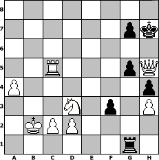 Partie-Notation im PGN-Format [Event "Schon wieder."] [Site "www.mySchach.de"] [Date "2017.10.12"] [Round "2"] [White "Helmut48"] [Black "Achimkogge"] [ECO "D00"] [WhitemyELO "1960"] [BlackmyELO "1340"] [Result "1-0"] [TimeControl "10/2592000"] [WhiteDays "117"] [BlackDays "116"] [MySchachNr "109909"] 1. d4 d5 2. e4 dxe4 3. Nc3 Nf6 4. f3 exf3 5. Qxf3 Qxd4 6. Be3 Qd8 7. Nh3 c6 8. Bd3 Bg4 9. Qg3 e6 10. Nf2 h5 11. h3 Bd6 12. Qh4 Bf5 13. Bxf5 exf5 14. O-O-O Qe7 15. Rhe1 Kf8 16. Bg5 Be5 17. Rxe5 Qxe5 18. Rd8+ Ne8 19. Nd3 Qe6 20. Qb4+ Kg8 21. Qxb7 Kh7 22. Qxa8 Nd7 23. a4 f6 24. Qxa7 fxg5 25. Qxd7 Qxd7 26. Rxd7 Nf6 27. Rc7 Ne4 28. Rxc6 Nxc3 29. Rxc3 f4 30. Rc5 Kh6 31. b4 Re8 32. b5 Re2 33. b6 Rxg2 34. b7 Rg1+ 35. Kb2 f3 36. b8=Q Kh7 37. Qe8 h4 38. Qh5+ 1-0 Stellungs-Notation im FEN-Format 8/6pk/8/2R3pQ/P6p/3N1p1P/1KPP4/6r1 - - - 1 38 Geschlagene Figuren Weiss: ![]() ![]() ![]() ![]() ![]() ![]() ![]() ![]() ![]() ![]() ![]() ![]() ![]() ![]() ![]() Geschlagene Figuren Schwarz: ![]() ![]() ![]() ![]() ![]() ![]() ![]() ![]() ![]() ![]() ![]() ![]() ![]() ![]() ![]() Klicken Sie auf eine geschlagene Figur um den gewünschten Zug darzustellen!