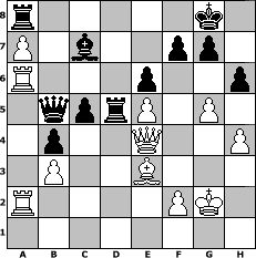 Partie-Notation im PGN-Format [Event "Bremer Schl"] [Site "www.mySchach.de"] [Date "2008.11.01"] [Round "2"] [White "HenrySchinasky"] [Black "dbuse"] [ECO "E15"] [WhitemyELO "2045"] [BlackmyELO "2055"] [Result "1-0"] [TimeControl "10/2592000"] [WhiteDays "101"] [BlackDays "102"] [MySchachNr "49437"] 1. d4 Nf6 2. c4 e6 3. Nf3 b6 4. g3 Bb4+ 5. Bd2 Be7 6. Bg2 c6 7. O-O d5 8. Nc3 Bb7 9. Ne5 Nbd7 10. e4 Nxe4 11. Nxe4 dxe4 12. Bxe4 Nxe5 13. dxe5 Qc7 14. Bc3 a6 15. Qf3 Rb8 16. a4 c5 17. a5 Bxe4 18. Qxe4 b5 19. cxb5 axb5 20. a6 O-O 21. Rfd1 b4 22. Be1 Rfc8 23. Bd2 Qb6 24. Ra4 Rd8 25. a7 Ra8 26. Rda1 Rd5 27. Kg2 Bd8 28. Be3 Qb5 29. Ra6 Bb6 30. R1a4 Bc7 31. b3 h6 32. Ra1 Bb6 33. h4 Kh8 34. g4 Bc7 35. R1a2 Kg8 36. g5 1-0 Stellungs-Notation im FEN-Format r5k1/P1b2pp1/R3p2p/1qprP1P1/1p2Q2P/1P2B3/R4PK1/8 - - - 0 36 Geschlagene Figuren Weiss: Geschlagene Figuren Schwarz: Klicken Sie auf eine geschlagene Figur um den gewünschten Zug darzustellen!