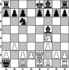 Partie-Notation im PGN-Format [Event "Sweety Tunier"] [Site "www.mySchach.de"] [Date "2006.02.28"] [Round "1"] [White "Andylein1989"] [Black "Robur"] [ECO "B02"] [WhitemyELO "1660"] [BlackmyELO "1721"] [Result "0-1"] [TimeControl "10/2592000"] [WhiteDays "60"] [BlackDays "28"] [MySchachNr "22930"] 1. e4 Nf6 2. Nc3 d5 3. exd5 Nxd5 4. Nge2 Bg4 5. f3 Bf5 6. b3 Nc6 7. Nxd5 Qxd5 8. Nf4 Qe5+ 9. Qe2 Qxa1 0-1 Stellungs-Notation im FEN-Format r3kb1r/ppp1pppp/2n5/5b2/5N2/1P3P2/P1PPQ1PP/q1B1KB1R - KQkq - 0 10 Geschlagene Figuren Weiss: Geschlagene Figuren Schwarz: Klicken Sie auf eine geschlagene Figur um den gewünschten Zug darzustellen!
