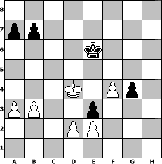 Partie-Notation im PGN-Format [Event "5erd4"] [Site "www.mySchach.de"] [Date "2022.06.29"] [Round "1"] [White "Rotstift10"] [Black "miu"] [ECO "E38"] [WhitemyELO "1645"] [BlackmyELO "1599"] [Result "1-0"] [TimeControl "10/3456000"] [WhiteDays "168"] [BlackDays "197"] [MySchachNr "126215"] 1. d4 Nf6 2. c4 e6 3. Nc3 Bb4 4. Qc2 c5 5. Nf3 d5 6. a3 Bxc3+ 7. Qxc3 Nc6 8. Bg5 h6 9. Bh4 g5 10. Bg3 Ne4 11. Qd3 Qa5+ 12. Kd1 cxd4 13. cxd5 exd5 14. Nxd4 Qa4+ 15. Nc2 Bf5 16. b3 Qa5 17. Kc1 Nxg3 18. Qxg3 Qc5 19. Qe3+ Qxe3+ 20. fxe3 Bxc2 21. Kxc2 O-O 22. g3 Rac8 23. Kb2 Rfe8 24. Rd1 Rcd8 25. Rd3 d4 26. Bg2 Rxe3 27. Bf3 f5 28. Rd1 g4 29. Rxe3 dxe3 30. Bd5+ Kg7 31. Kc3 Ne7 32. Kc4 Kf6 33. Rd3 Nxd5 34. Rxd5 Re8 35. Kd3 Re7 36. Kd4 h5 37. Kd3 h4 38. Rd6+ Kg5 39. Rd5 hxg3 40. hxg3 Kf6 41. Kd4 f4 42. Rd6+ Re6 43. Rxe6+ Kxe6 44. gxf4 1-0 Stellungs-Notation im FEN-Format 8/pp6/4k3/8/3K1Pp1/PP2p3/3PP3/8 - - - 0 44 Geschlagene Figuren Weiss: Geschlagene Figuren Schwarz: Klicken Sie auf eine geschlagene Figur um den gewünschten Zug darzustellen!